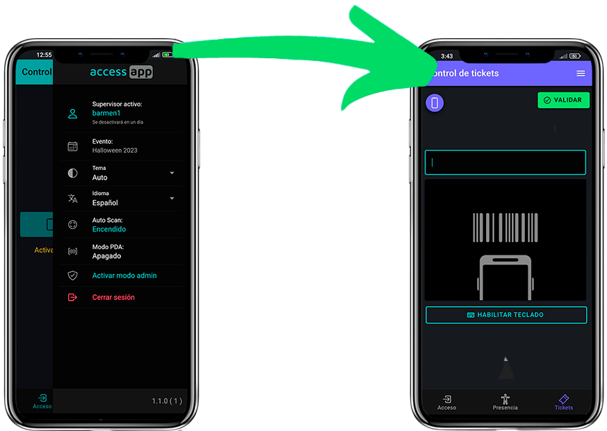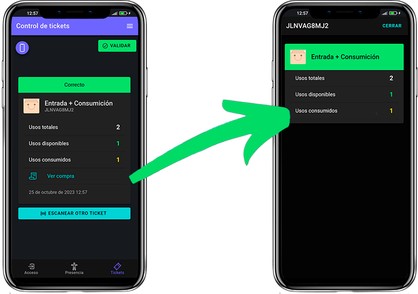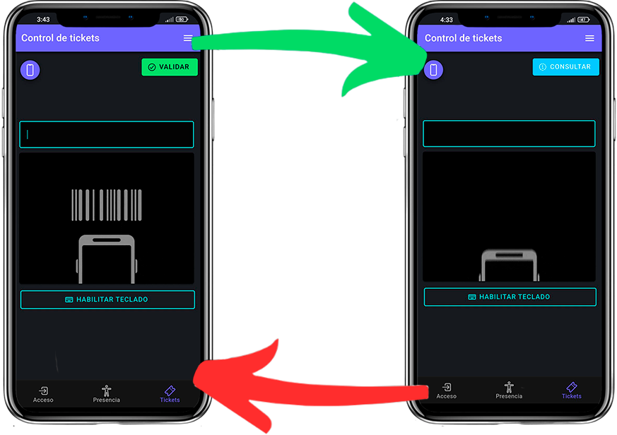 Si deseas alternar rápidamente entre "validaciones" y "consultas", no necesitas buscar a través de numerosos ajustes en la aplicación, simplemente presiona un botón para agilizar el proceso.Si simplemente quieres consultar el estado de un ticket escanea en modo "consulta",si lo quieres consumir escanea en el modo "validación".